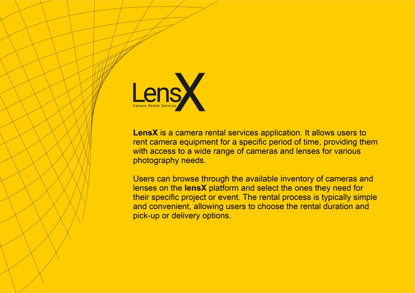 LensX is a camera rental services application. It allows users to rent camera equipment for a specific period of time, providing them with access to a wide range of cameras and lenses for various photography needs.